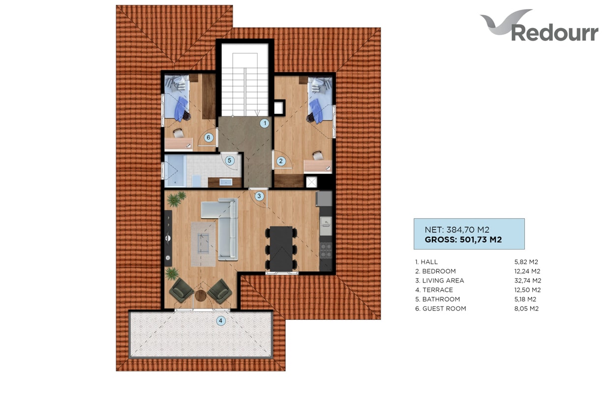 1. Hall: 5,82 m2 2. Bedroom: 12,24 m2